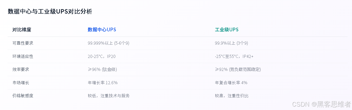相比之下,工业级 UPS 的可靠性要求虽然也很高,但更注重在恶劣环境下的持续运行能力。工业 UPS 通常采用 N+1 冗余配置,关键部件如功率模块、控制模块等采用冗余设计,但整体冗余度低于数据中心 UPS。工业应用更关注 UPS 在高温、高湿、粉尘、振动等恶劣环境下的稳定性和适应性。