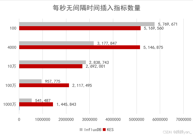 在数据写入吞吐层面,性能表现随数据规模呈现明显分化。测试覆盖了从100台到1000万台设备的多种数据压力场景。当设备数量达到4000台(每台监控10个指标)时,金仓的每秒数据插入指标数已达到InfluxDB的162%;在千万级设备的极限压力场景中,金仓的性能领先幅度进一步扩大至267%。这充分验证了在应对海量设备持续高并发写入时,金仓架构所具备的卓越扩展性和稳定性。