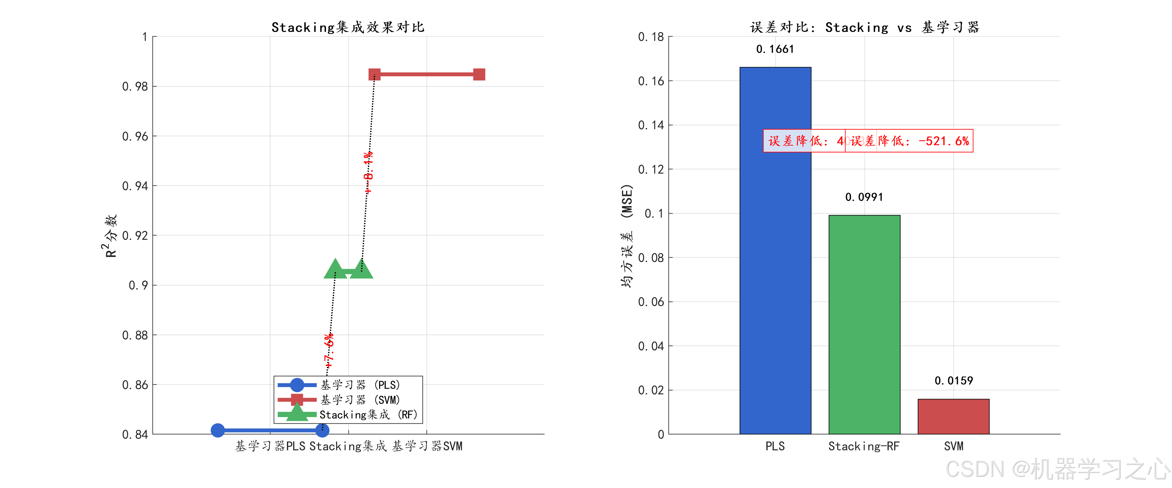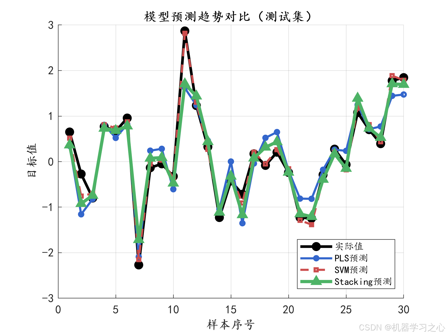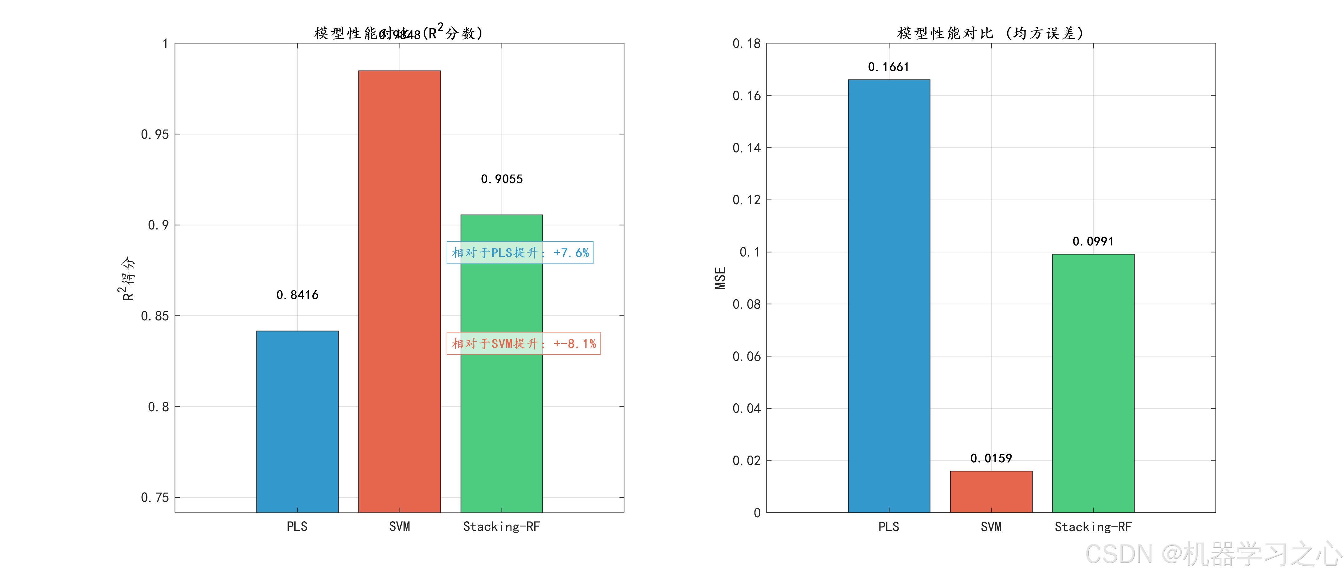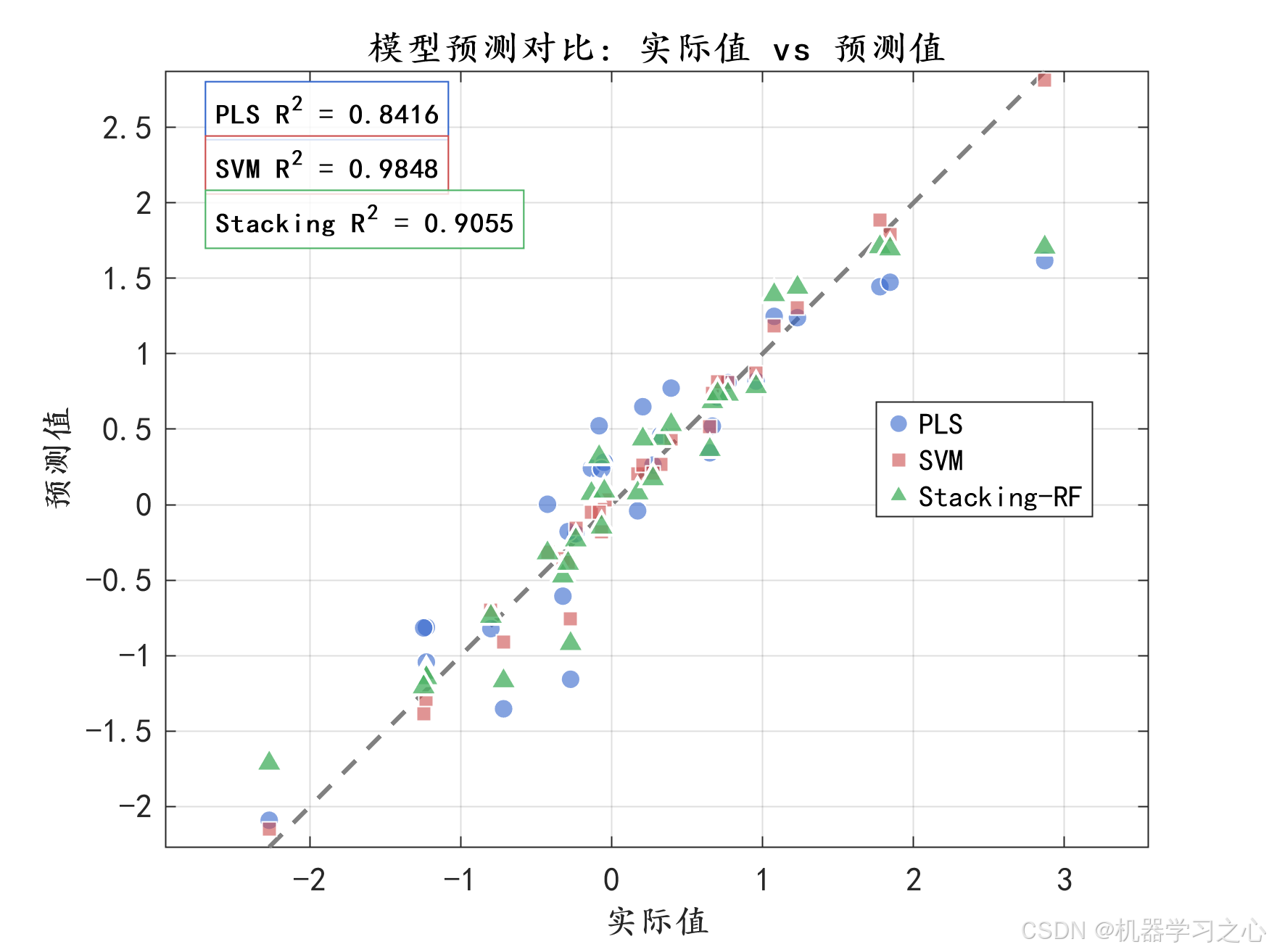 - 模型评估:对比PLS、SVM和Stacking-RF在训练集和测试集上的性能。