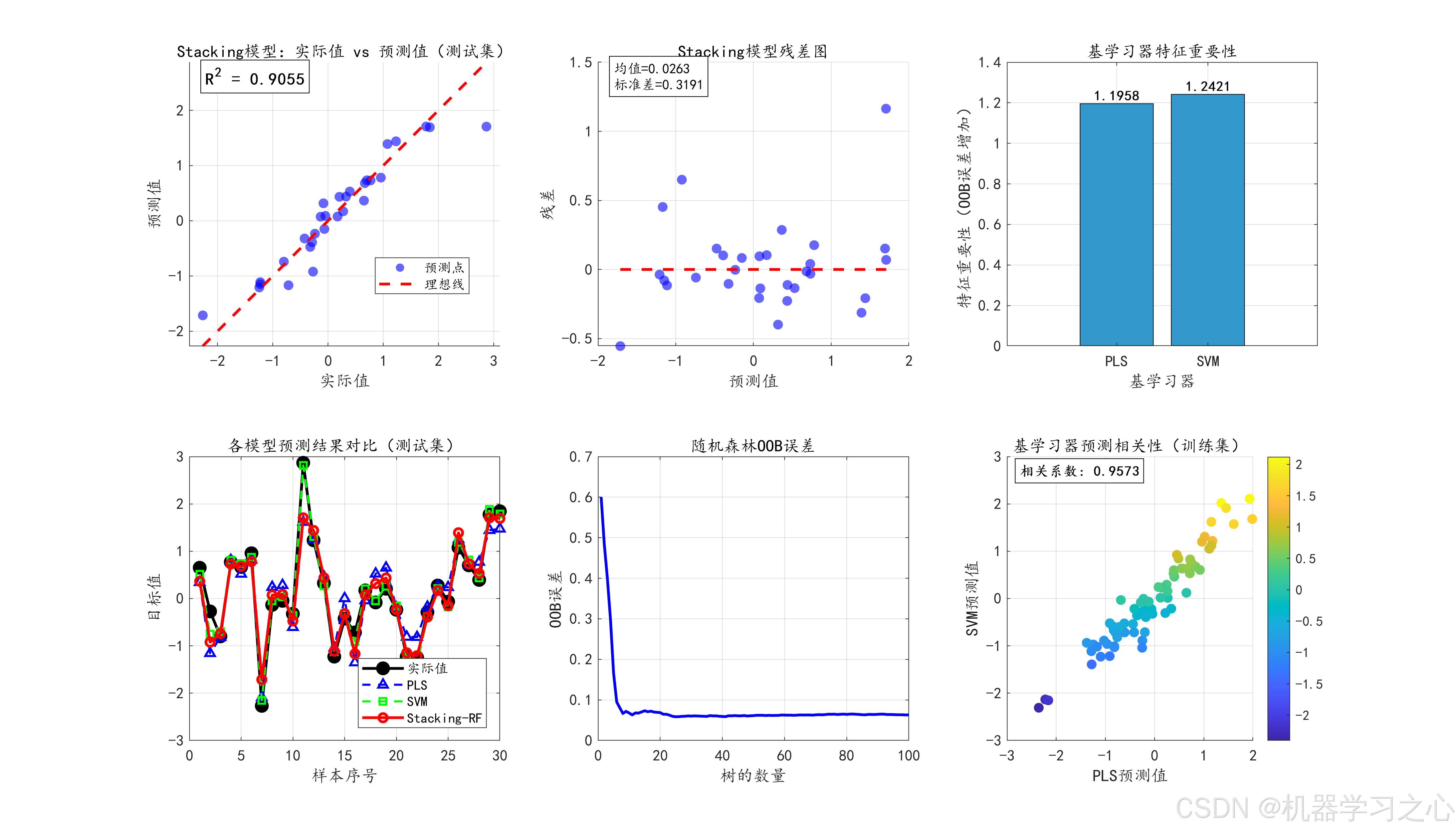 原始数据 → 归一化 → 划分数据集 → 训练PLS → 训练SVM(调参) → 构建元特征 → 训练随机森林 → 预测与评估 → 可视化输出