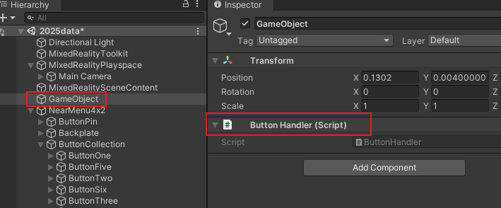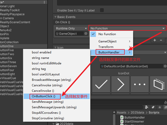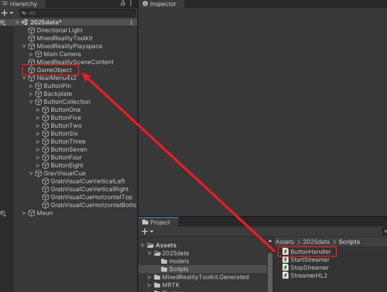 2)将ButtonHandler.cs拖拽到新建的空对象上
