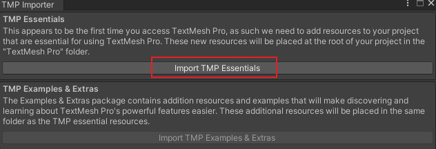 TMPro.TMP_PackageResourceImporterWindow:OnGUI () (at Library/PackageCache/com.unity.textmeshpro@2.1.4/Scripts/Runtime/TMP_PackageResourceImporter.cs:215)