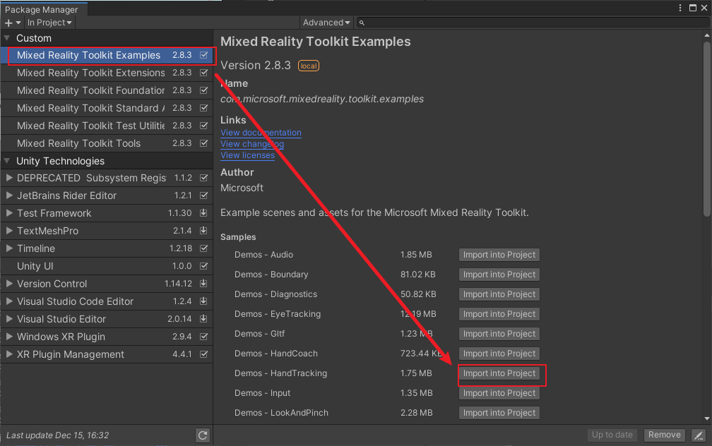 Mixed Reality Toolkit Examples → Demos-HandTracking → lmport into Project