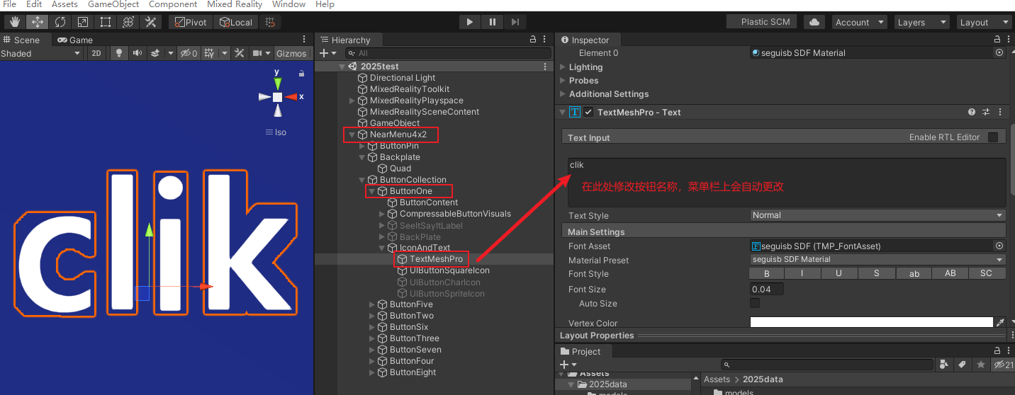 在Hierarchy 选项窗口下,找到ButtonOne 按钮里的TextMeshPro 双击