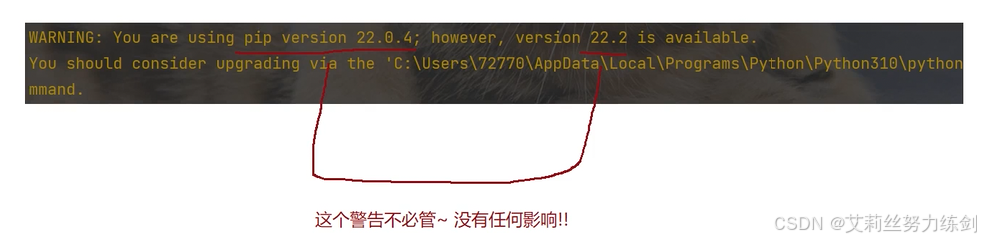 注意:pip安装的时候可能会有警告,提示使用的pip版本太低,这个警告我们不必处理,不影响我们正常使用。