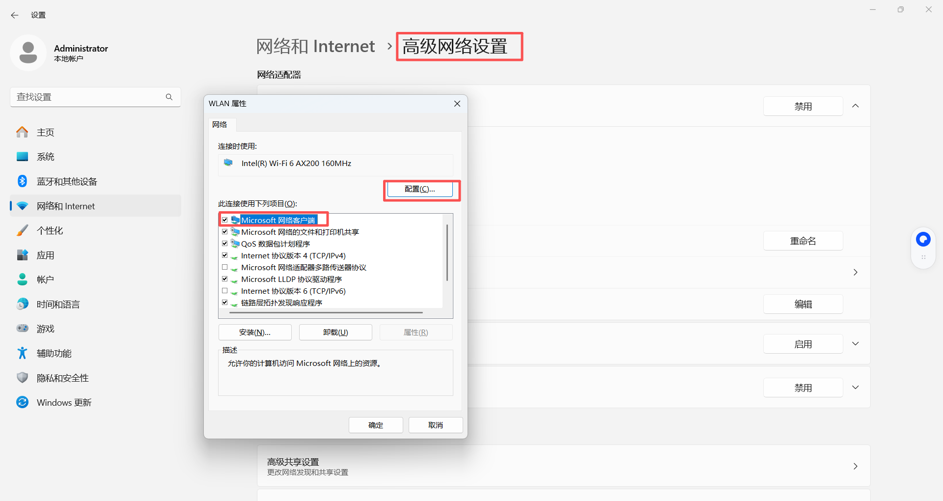 如果时从网络适配器进入的,点击第一个然后配置,从设备进入的直接点高级就行