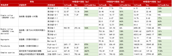 在数据写入吞吐方面 ,性能差距随数据规模扩大而急剧拉大。测试模拟了从 100 台到 1000 万台设备的不同数据压力。当设备规模达到 4000 台(每台 10 个指标)时,金仓的每秒数据插入指标数已达到 InfluxDB 的 162% ;而在千万级设备的极限压力测试中,金仓的性能优势进一步扩大至 267%。这充分证明,在面对海量设备的高并发持续写入时,金仓的架构具备更优的可扩展性与稳定性。