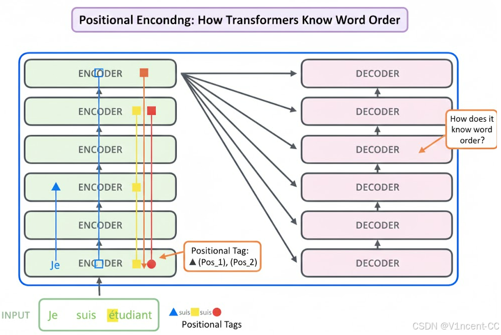 那么Transformer是怎么知道词的先后顺序呢?为了避免模型认为"我爱吃鱼"和"鱼爱吃我"是一回事,Transformer 会给每个词贴上一个带有位置信息的"标签",让模型知道谁在前,谁在后。