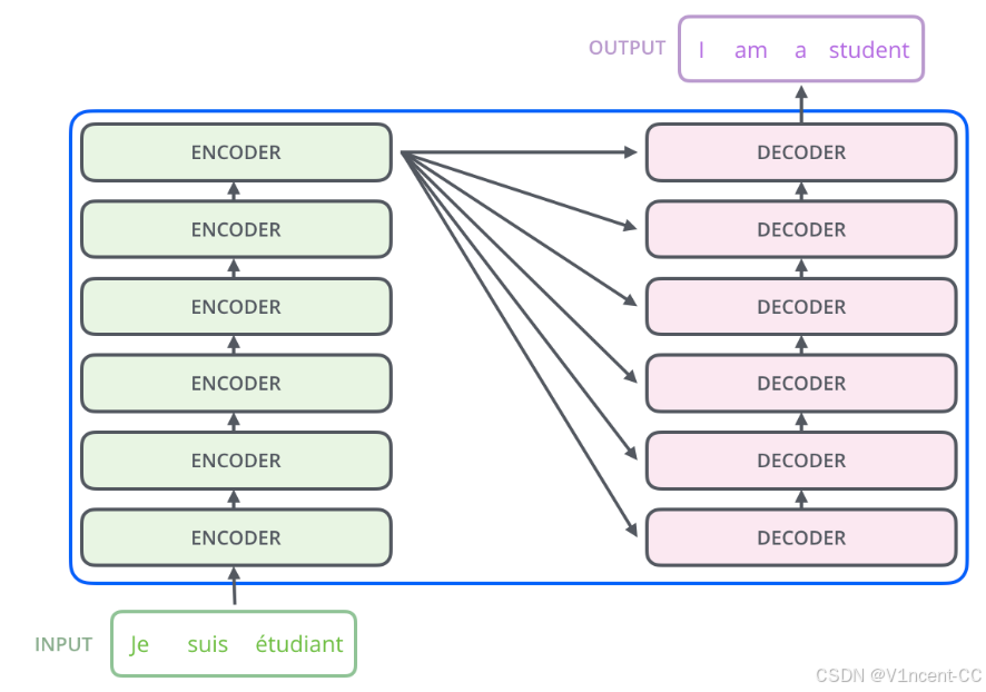 - 编码器(Encoder)------"理解者": 它的任务是读入输入的文字,然后把每个词转换成包含丰富上下文信息的"密码"(使用嵌入算法将词转换为向量,可以简单理解为用一组数字去表示词语)。编码器由完全相同的结构堆叠而成,每一层都试图比上一层更深地理解句子。