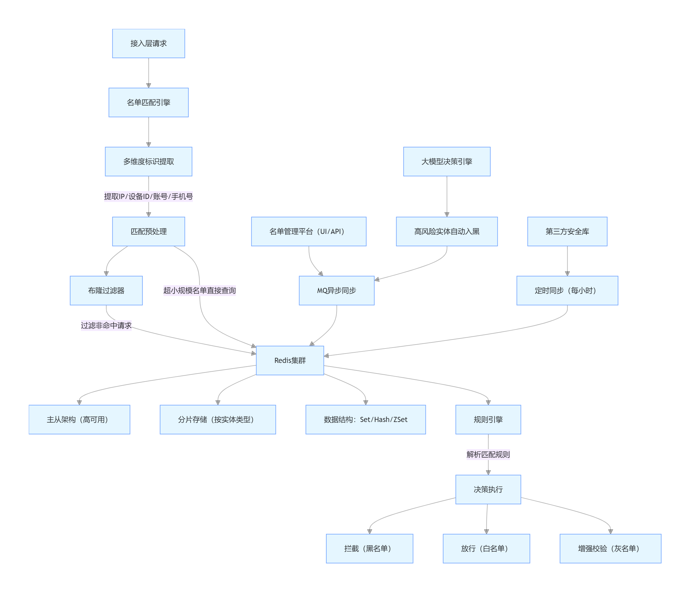 - 链路逻辑:核心决策链路(上半部分)+ 名单同步链路(下半部分)分离,清晰区分 "请求处理" 与 "名单维护" 两大核心流程;