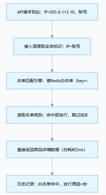 | 精准名单 | 绑定特定规则的细分实体集合 | 按业务场景定制(如 "仅禁止参与优惠券活动的账号""仅允许访问特定 API 的 IP") | 命中后执行细分规则(而非全局拦截 / 放行) | 按需配置(如活动周期内有效) | 场景化风控(如支付风控、活动风控、API 权限控制) |
