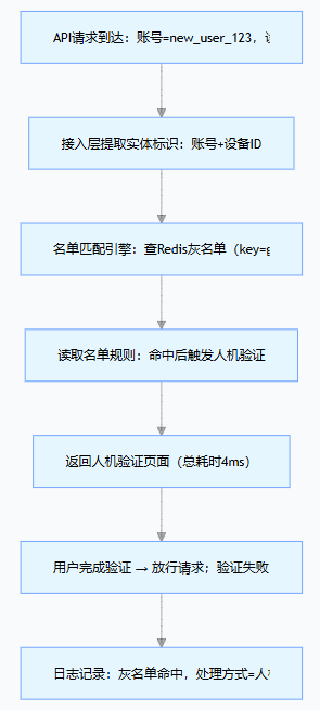 | 灰名单 | 可疑但未确认恶意的实体集合 | 1. 行为异常但未达高风险阈值(如请求频率略高);2. 关联风险实体(如同一设备登录多个账号);3. 新注册未验证的账号 | 命中后增强校验(如人机验证、短信验证、限制 QPS) | 短期有效(1-7 天),到期自动失效或重新评估 | 新用户注册、可疑设备登录、低频异常请求 |