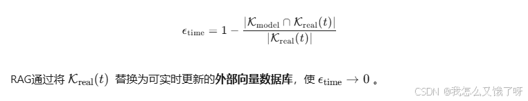 LLM仅内嵌训练语料的静态知识快照,对后续事件无能为力。设知识库更新周期为 ( \Delta t ),则模型知识时效性误差可量化:
