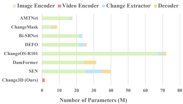 - 首先,Change3D 中的模型参数分布主要集中在视频特征编码上,这是一个擅长有效提取变化的特定任务过程。
