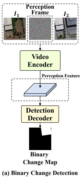 为了探索我们所提方法的通用性,我们将 Change3D 应用于变化检测和描述任务。如图 3 所示,我们首先初始化一定数量的感知帧,对应于每个任务的解码器数量。随后,这些帧与双时相图像沿时间维度堆叠,组成输入视频帧。然后,使用视频编码器促进感知帧与双时相图像之间的交互以产生感知特征。最后,相应的解码器将感知特征转换为变化图或描述。