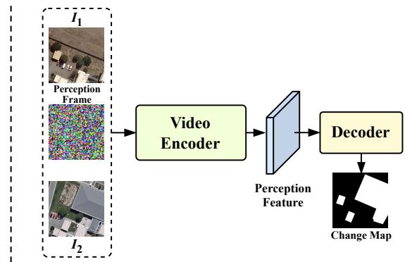 在先前研究的基础上,我们将双时相图像重新概念化为包含两个帧的微型视频。通过整合感知帧,采用视频编码器促进了变化的有效捕捉。