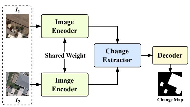 - 变化提取:然后,引入一个精心设计的变化提取器,主要利用注意力机制 [70](如交叉注意力 [5] 或空间通道注意力 [78])进行双时相特征交互,以检测它们之间的差异。