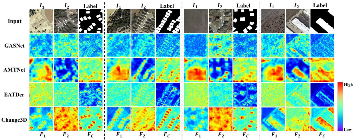 注意力可视化。图 4 展示了注意力图。观察结果表明:(1) Change3D 的感知特征可以通过与双时相特征的交互有效地辨别变化,无需专用的变化提取器;(2) Change3D 有效地集中在变化区域。