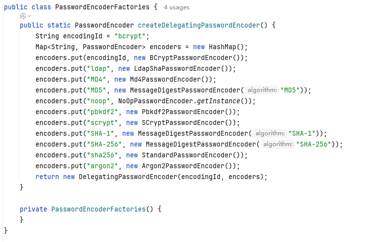 通过观看源码我们可以知道,我们使用noop表示不加密使用明文密码,现在我们只需要将noop改为bcrypt即可。