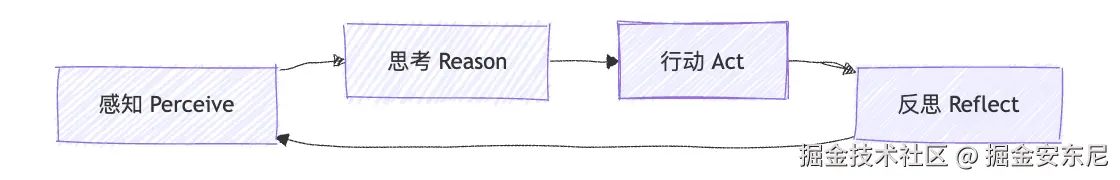 | 感知(Perceive) → 思考(Reason) → 行动(Act) → 反思(Reflect) |