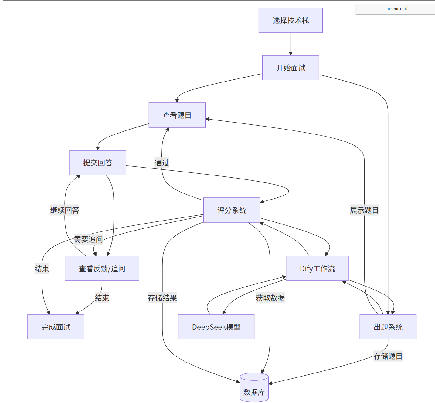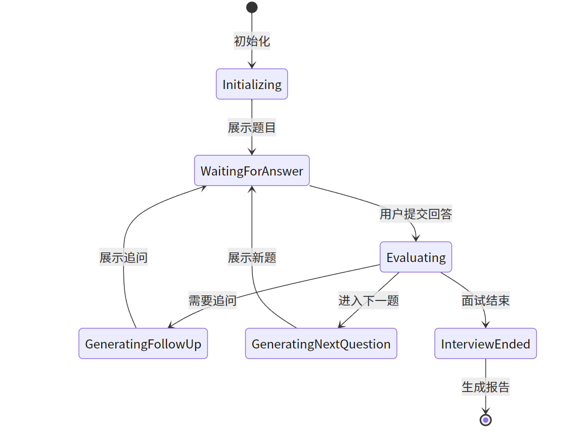 前端实现了完整的面试流程控制,包括题目展示、回答提交、追问处理等: