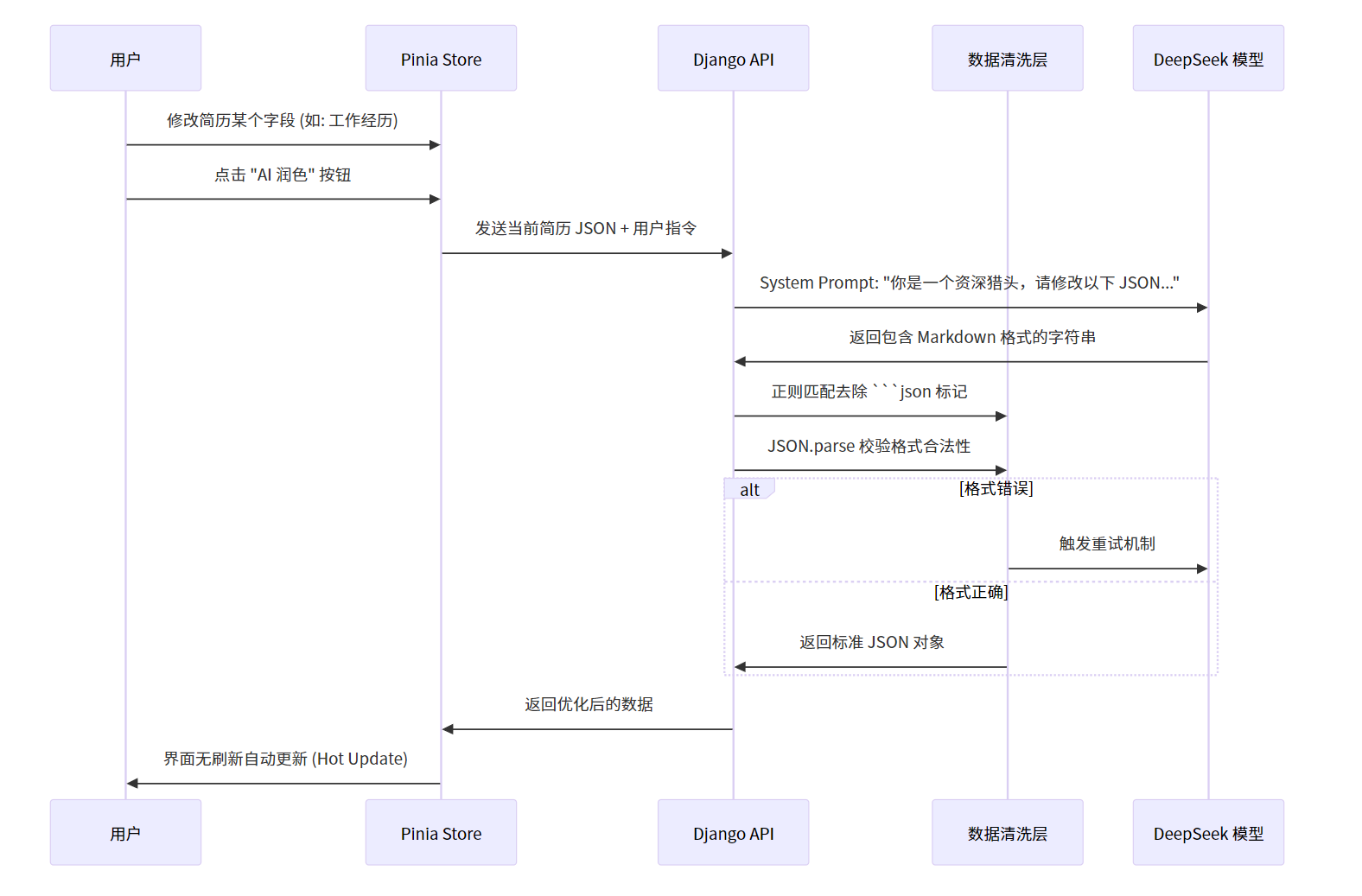 resume_json存储完整的结构化简历(个人信息、经历、教育等),避免了传统 EAV (Entity-Attribute-Value) 模型的复杂连表查询,同时完美契合前端 JSON 数据结构,实现 "Read-Modify-Write" 的闭环。