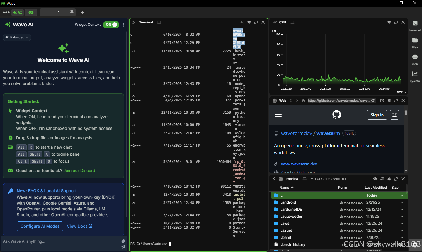 waveterm (全称 Wave Term )是一款 跨平台、基于 Web 的现代终端 ,核心采用 Go 编写的后端服务 + React + TypeScript 的前端渲染。它的目标是把传统的本地终端提升为 多会话、多标签、可共享、可自定义 的交互式工作台,让开发者在浏览器或任何支持 WebSocket 的环境中获得和本地 ssh/bash 相近甚至更好的使用体验。
