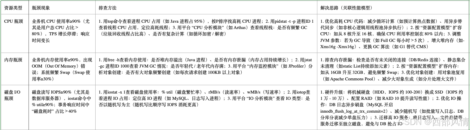 业务系统的 CPU、内存、磁盘 I/O 等硬件资源达到上限,会直接限制 TPS 提升,需结合前期 "资源配置模型"(如 CPU 利用率≤80%、内存≤70%、磁盘 IOPS≤80%)排查: