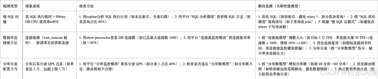 数据库(MySQL、MongoDB 等)是压测中最常见的瓶颈点,尤其是高并发写入 / 查询场景,需结合前期 "分库数模型""慢 SQL 反模式" 排查: