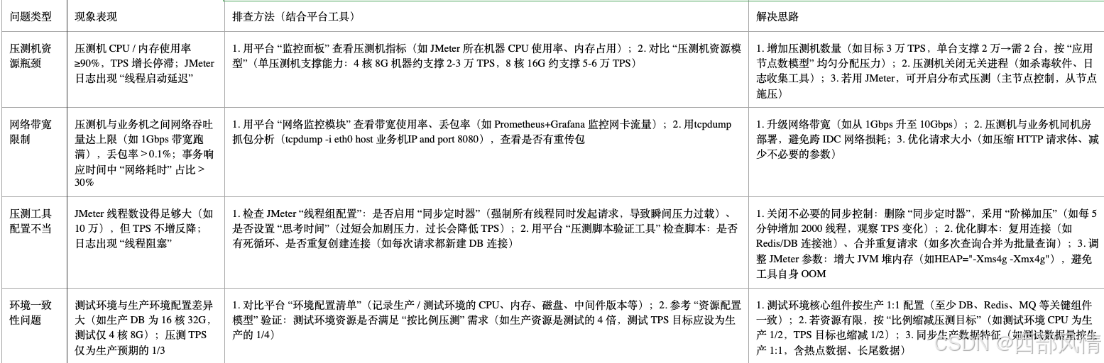 在性能压测中,TPS(Transactions Per Second,每秒事务数)未达预期(如目标 3 万 TPS,实际仅 1.5 万)是最常见问题,其本质是 "压测压力未有效传递至业务系统,或系统某环节无法承载当前压力,又或环境,工程,网络,DB,中间件困素引起",此时需基于 "端到端链路拆解" 思路,结合前期性能模型(TPS - 并发数模型、资源配置模型)与反模式库,定位瓶颈点并针对性优化。