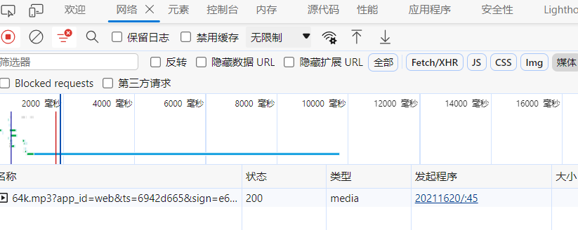 这里我们找到了蜻蜓FM的网站,选择你要听的网址,如下图,当前页面输入F12,调出开发界面,刷新网页,点击网络,选择媒体,点开该文件,会出现如上图的界面,