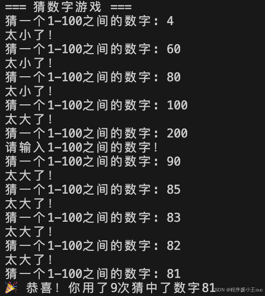 print(f"🎉 恭喜!你用了{attempts}次猜中了数字{target}")