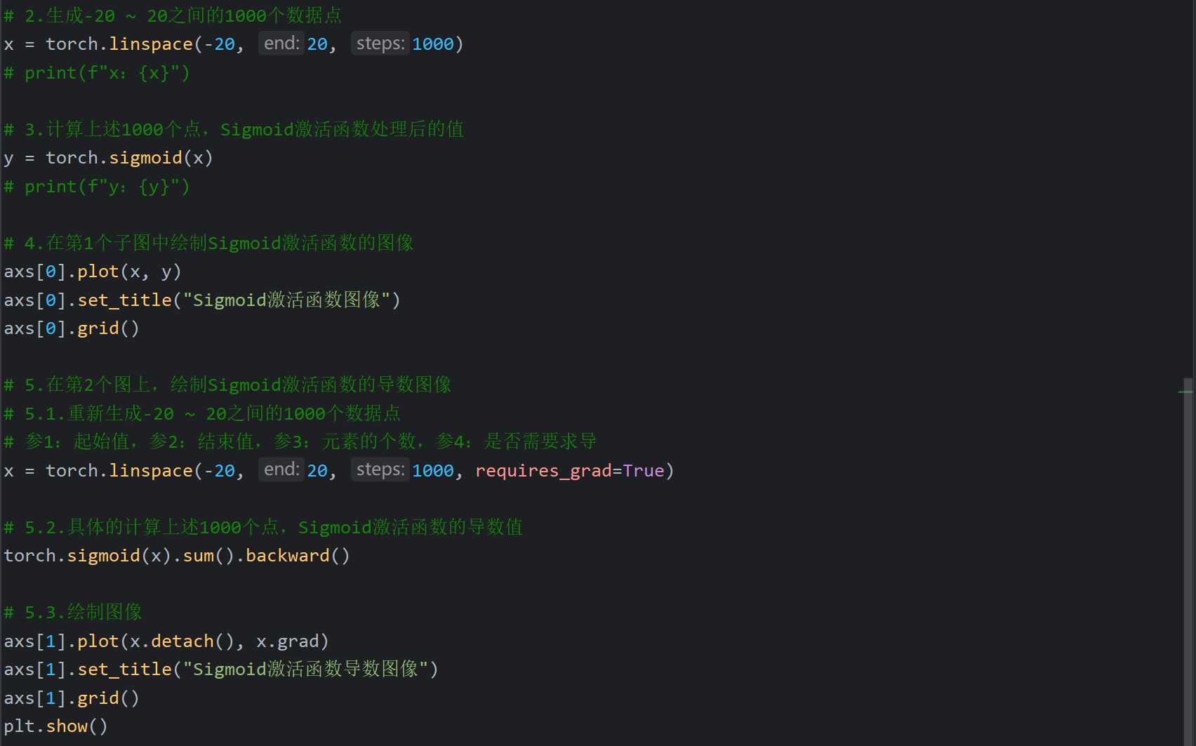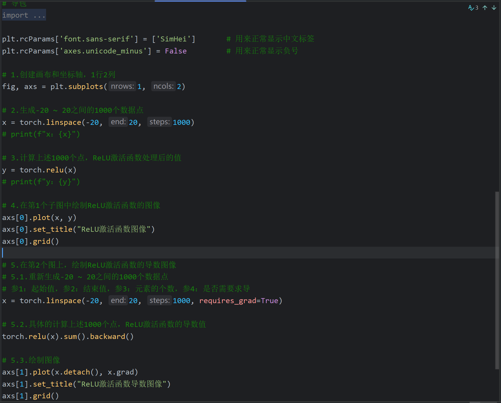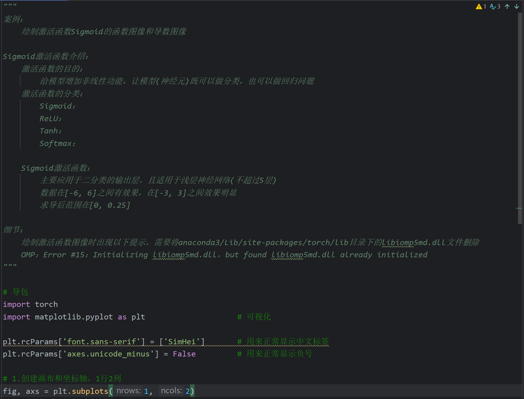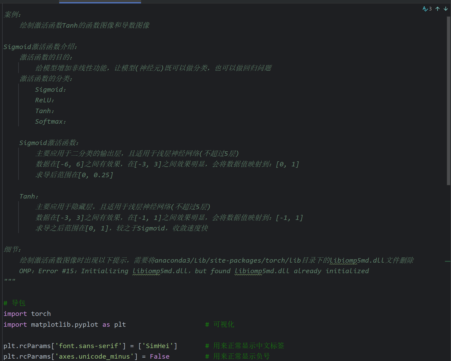 这里后续是代码演示但是视频不全,我根据下一个视频中Tanh激活函数的代码返回来敲了一下
