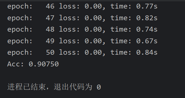 我这里是学着老师一样把轮数epochs改为了50,然后把学习率改为了0.001,等一会也是能跑出结果的,就是我配置不如老师跑的比较久一点