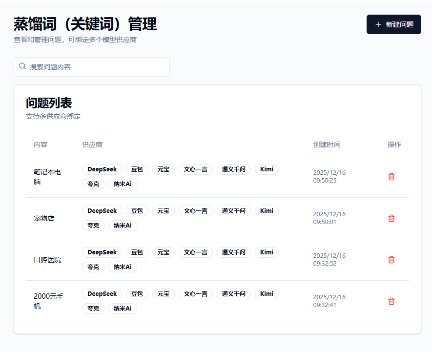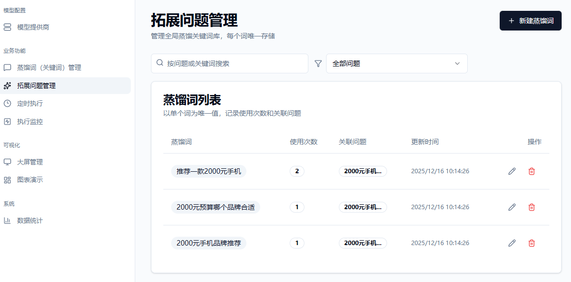 - 场景化问题拓展:围绕核心关键词,用户可以设置相关的拓展问题,系统将自动追踪这些问题的回答情况,提供更全面的分析视角。