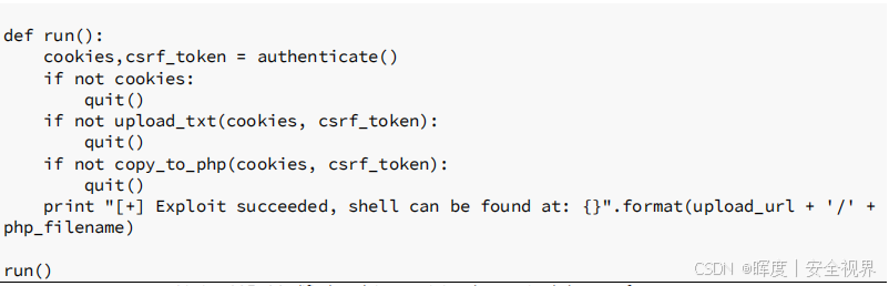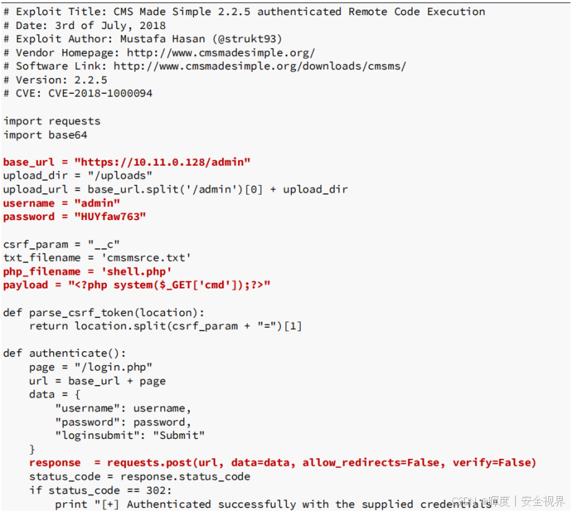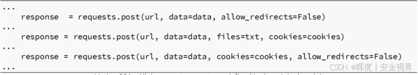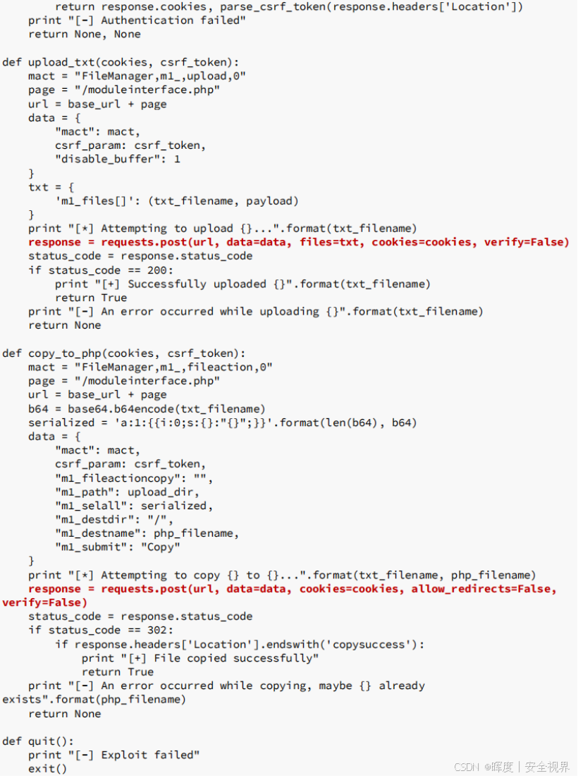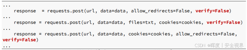 需要在漏洞利用代码中考虑到这一点,即:忽略SSL证书验证 。具体来说,漏洞利用使用Requests Python库与目标进行通信。利用代码在第34行、55行和80行上进行了三次POST请求:
