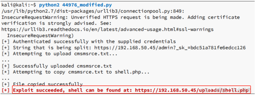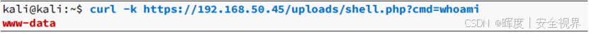 错误不再显示,我们收到一条消息告诉我们攻击成功了。现在我们可以使用类似curl的工具连接到这个PHP shell( https://192.168.50.45/uploads/shell.php),并提供一个系统命令作为Payload来验证攻击。
