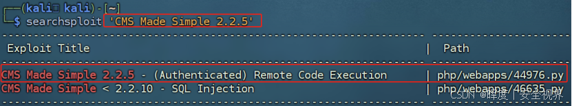 CMS Made Simple 2.2.5版本似乎存在远程代码执行漏洞RCE ,并且Exploit-DB上有公开的利用工具可用(代码链接:CMS Made Simple 2.2.5漏洞利用脚本)。如下图(红框),是一个身份验证后的RCE漏洞。