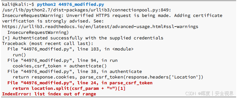 运行修改后的脚本44976_modified.py,提示程序在第24行 的parse_csrf_token函数执行过程中触发异常。如下图: