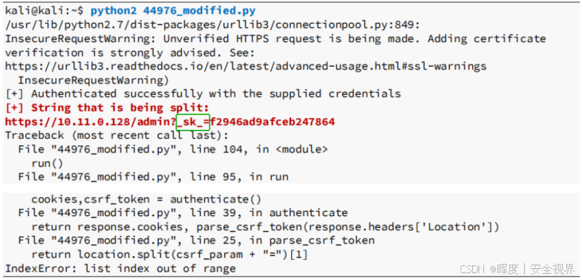 漏洞利用代码预期 使用**__c** 作为CSRF参数名,但目标系统实际 使用的是 _sk_,导致字符串分割失败和索引越界错误。