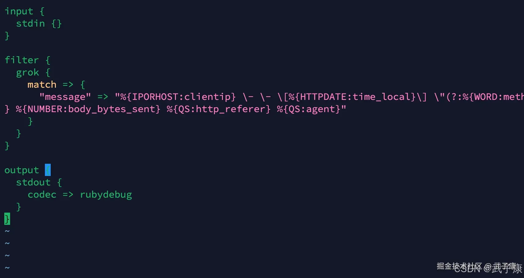 定义Logstash的配置文件如下,我们从控制台输入Nginx的日志数据,然后经过Filter的过滤,将我们的日志文件转换为标准的数据格式: