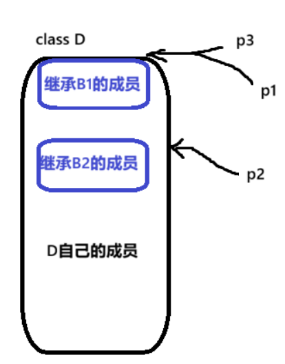 p1和p2只能指向d继承父类的部分,p1指向B1部分,p2指向B2部分。而且,虽然p1 == p3但是两个指针的含义也是不同的,p1是对继承父类B1的切片,p3指向的是整个D。