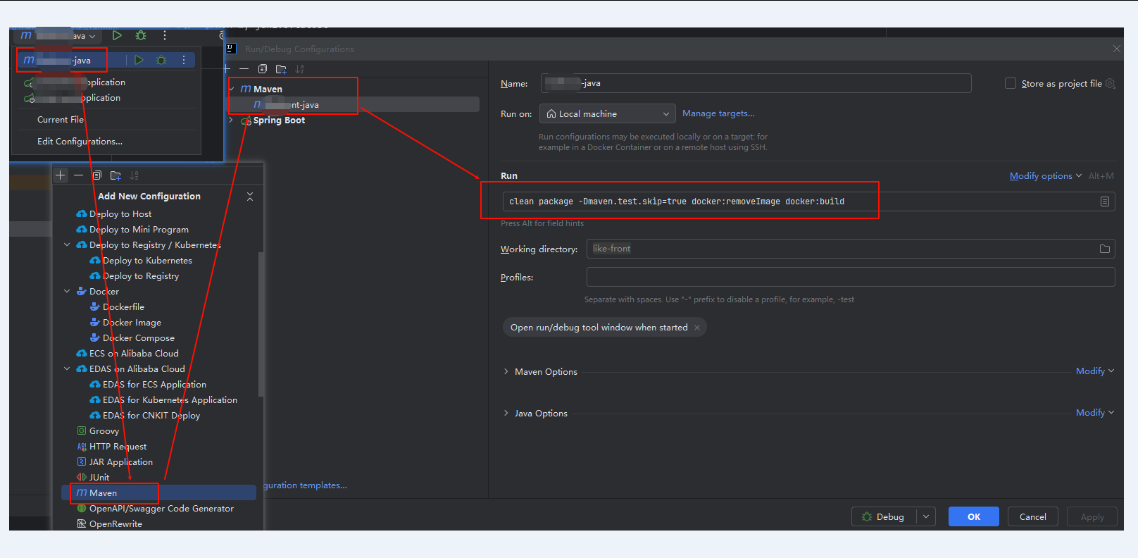 如果是在IDEA中,就不需要配置mvn 。 之所以使用deploy,是因为我们在开发过程中可能会不断地 clean/install/package,如果绑定在这上面,那么后续我们所有的install..都会执行docker stop/docker build ...之类的命令,所以直接使用maven的deploy(部署)命令即可
