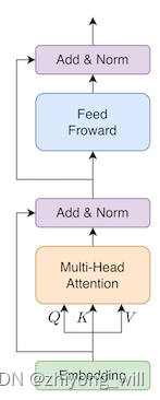 上图是Transformer 的内部结构图,左侧为 Encoder block,右侧为 Decoder block。红色圈中的部分为 Multi-Head Attention,是由多个 Self-Attention组成的,可以看到 Encoder block 包含一个 Multi-Head Attention,而 Decoder block 包含两个 Multi-Head Attention (其中有一个用到 Masked)。Multi-Head Attention 上方还包括一个 Add & Norm 层,Add 表示残差连接 (Residual Connection) 用于防止网络退化,Norm 表示 Layer Normalization,用于对每一层的激活值进行归一化。