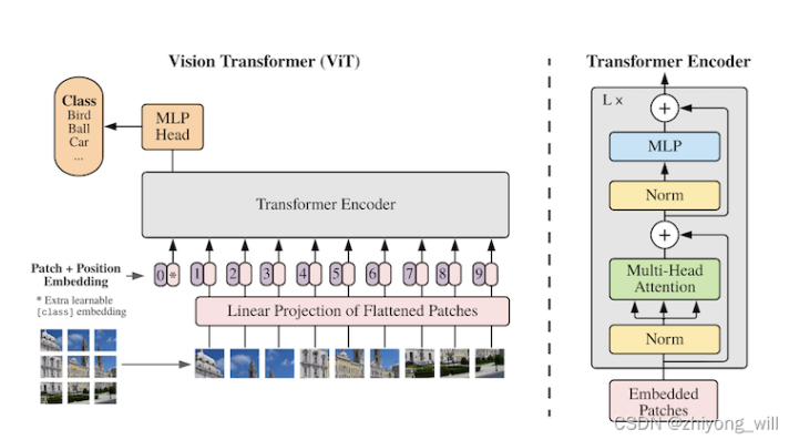 ViT模型的网络结构如上图的右半部分所示,与原始的Transformer中的Encoder不同的是Norm所在的位置不同,类似BERT模型中[class]标记位的设置,ViT在Transformer输入序列前增加了一个额外可学习的[class]标记位,并且该位置的Transformer Encoder输出作为图像特征。