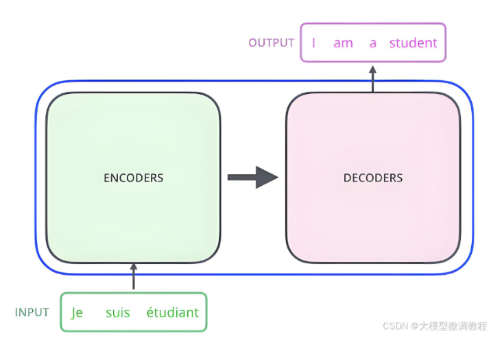 可以先将 Transformer 模型视为一个黑盒:通俗地说、Transformer就是一个翻译器。在机器翻译任务中,将一种语言的一个句子作为输入,然后将其翻译成另一种语言的一个句子作为输出。中间部分由编码器 和 解码器两部分组成。