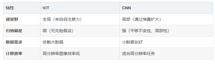 与传统卷积神经网络(CNN)相比,ViT具有全局建模能力,因为自注意力机制允许任意两个图像块直接交互,克服了CNN的局部感受野限制。然而,ViT对数据量依赖较大,需在大规模数据集(如JFT-300M)上预训练才能避免过拟合,而CNN在小数据集上表现更稳健;此外,ViT的计算复杂度随序列长度平方增长,处理高分辨率图像时效率较低,而CNN更适合密集视觉任务。在归纳偏差方面,ViT几乎无先验假设(弱归纳偏差),需从数据中学习图像特性,而CNN隐式编码了局部性和平移不变性等先验知识(强归纳偏差)。