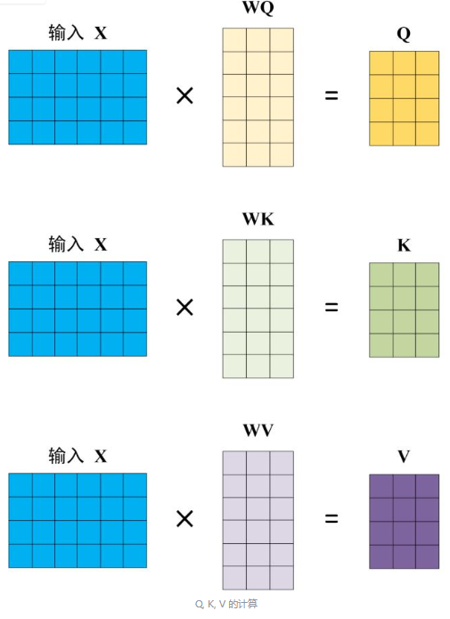 - 将输入向量转换为查询(Query)、键(Key)和值(Value)三个向量