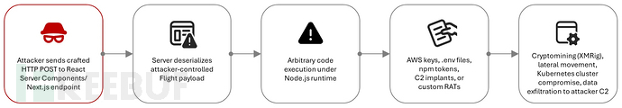 Beelzebub披露的另一项攻击活动中,威胁行为者利用Next.js漏洞(包括CVE-2025-29927和CVE-2025-66478)系统性地窃取凭证和敏感数据: