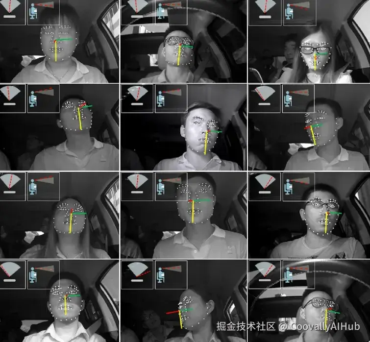- 一旦检测到驾驶员面部,系统会估计其头部朝向,以判断驾驶员正在看向何处------是直视前方道路、向下看向设备,还是看向侧方。接着,系统会聚焦于眼睛,分析眨眼频率、眨眼时长和视线方向,以评估注意力水平。